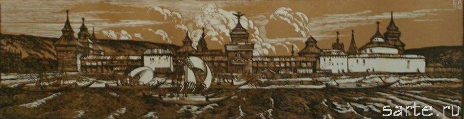 Линогравюра «Иркутский острог», приложенная к одноименному альбому, может быть отнесена к числу программных работ в наследии Б.И. Лебединского. В ней создан обобщенный образ сибирского исторического пейзажа, вбирающий в себя темы бурного движения и величавого покоя, борения и торжества. Форма оттиска, подчеркнуто вытянутая по горизонтали, позволяет художнику показать панораму могучей крепости, выросшей вдоль речного берега. Статичность, воплощенная во фронтальном положении острога, в протяженности его крепких стен, в мерном, уравновешенном ритме его башен, контрастирует с энергичным движением, выраженным в стремительном течении Ангары, в раздутых парусах летящих по волнам ладей, в очертаниях плотных кучевых облаков. Звучные пятна белого цвета в изображении острожных каменных палат, корабельных парусов, гребней волн усиливают впечатление приподнятой, драматической экспрессии этого пейзажа.